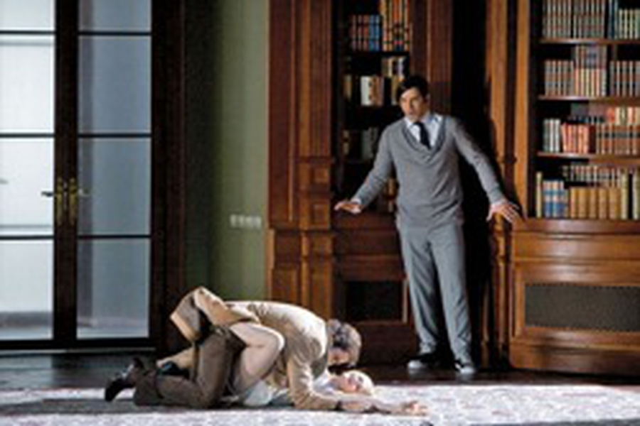Спектакли Дмитрия Чернякова можно смотреть по-разному. Лучше всего как дизайн-проект, то есть, совершенно отключившись от музыки, да и от драматического действия тоже. Ибо самой сильной стороной его постановок всегда была сценография – с фантазией и оригинальной эстетикой. Такими были его «Китеж», «Похождения повесы», «Воццек». И даже в противоречивом «Онегине» картинка Чернякову удалась: как бы вы не воспринимали постановку, саму «чеховскую» гостиную Лариных (1 – 5 картины) и новорусский банкетный зал Греминых (6 и 7 картины) рассматривать интересно и приятно. В «Дон Жуане», где оба акта играются в одной декорации, увы, нет даже этого пиршества визуального эстетизма. Действие расположилось в современной, безвкусно-дорогой гостиной-библиотеке: орехового дерева панели от пола до потолка с книжными шкафами и вмонтированными калориферами, матового стекла огромные двери и циклопическая люстра в потолке. Скучный, с претензией на респектабельность интерьер начала 21 века, более уместный в популярной телепередаче «Квартирный вопрос»: его визуальное оживление случается лишь однажды, во второй картине, когда комнату наполняют груды букетов и венков по случаю похорон Командора.