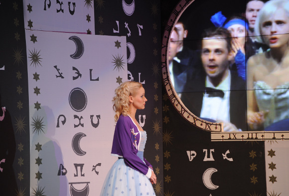 Безусловно, постановка, осуществленная народным артистом России Александром Петровым, оказалась яркой и впечатляющей. В драматургию оперы проникло такое новое слово как «видеоконтент». После недавнего ремонта театр приобрел новые технические возможности. И вот волшебство начинается. Взмах палочкой, и начинают крутиться причудливые фигуры на стенах театра, создавая ощущение движущегося пространства. Другой взмах — и оживают встроенные по двум сторонам сцены громадные видеоэкраны. Третий взмах — и появляются девочка со школьным портфелем, ее злая мачеха, и, к радости современных детей,— кадры из нашумевшего фильма «Гарри Поттер». Благодаря такой «видеозавязке» сказочная палочка передается девочке, и она исчезает в недрах пространства под названием Царство волшебника Зарастро. Прошла увертюра, а уже столько впечатлений!