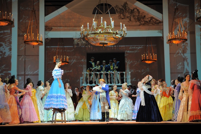 Музыкальное воплощение русского шедевра было доверено специалисту по Чайковскому Михаилу Плетнёву. У маэстро абсолютно свой взгляд на любимого композитора, в том числе и на его оперы: это помнится ещё по «Пиковой даме» в Большом в 2007 году. Особенно удивили темпы: предельно замедленные в большинстве картин, особенно в начальных, они превращают хотя и романтическую, но всё-таки весьма жизненную коллизию почти в медитативно-ритуальное действо а ля «Лоэнгрин» или «Парсифаль». Иногда кажется, что музыка вот-вот вовсе остановится – но нет, Плетнев крепко держит все компоненты оперы, и ощущение, что всё неминуемо рассыплется, оказывается ложным. Зачем это нужно маэстро, понимаешь в тех фрагментах, которые он делает не просто динамичными, но даже бравурными, а порой — взвинченными до истерики: контраст — вечная аксиома музыки, и владеет ею Плетнёв превосходно, выстраивая свою, неповторимую драматургию известной до последней ноты оперы.