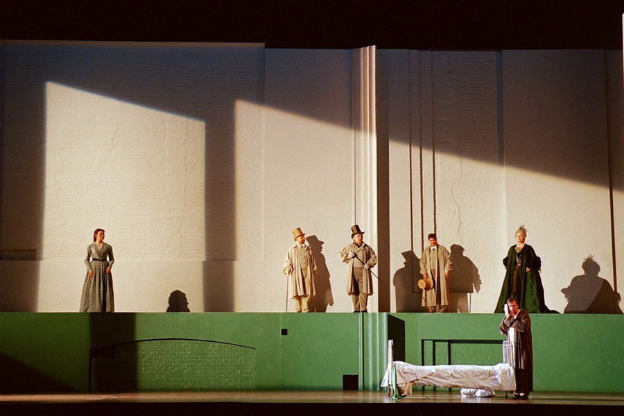 Идеи братьев Чайковских отменяются: музыка Петра звучит, слова Модеста произносятся, но интерпретирует режиссёр «Пиковую даму» «по Пушкину». Никакой пули в финале – Герман оканчивает свои дни в сумасшедшем доме, точнее в Обуховской больнице. Причём пребывает он в ней с самого начала спектакля: именно безумные видения, проплывающие в его воспалённом мозгу – суть картины оперы, которые видит перед собой Герман. Именно в этих бредовых фантазиях оказывается возможным вальс Германа и Графини в её спальне, явление старухи на балу вместо обещанной императрицы Екатерины, и много ещё прочих надуманных изобретательным режиссёром вещей, интересных самих по себе, но не имеющих никакого отношения к Чайковскому. Льву Додину очень хочется поставить повесть Пушкина, рассказать историю расчётливого немца Германна (именно так, по Пушкину, с удвоенной «н» на конце – как фамилия, а не как имя) и глуповатой воспитанницы Лизаветы Ивановны с известной долей иронии, с которой к своим героям относился Пушкин, у которого, как известно, даже призрак Графини шаркал домашними туфлями. Всё это замечательно и вполне допустимо… но не в оперном театре! На самом деле такая интерпретация вкупе с музыкой Чайковского, которая написана всё-таки не в 30-е годы, а в конце 19 века, и изобилует крайне напряжённым драматизмом, не приближает историю к литературному первоисточнику, а в известной степени даже отдаляет – на сцене не Пушкин, и не Чайковский, а самый что ни на есть Петербург Достоевского. Этому, кстати, весьма способствуют и талантливые сами по себе декорации Давида Боровского. Очень глубоко, психологично, занимательно, берёт за живое, но… увы, это совсем не опера Чайковского!