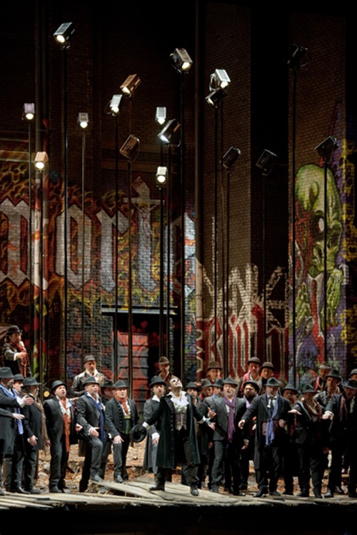 …Живости восприятия музыкально-сценического «синтеза» спектакля «Сан-Карло» совершенно не мешает то обстоятельство, что его сценографическая картинка, практически одинакова на все четыре действия (с небольшими модификациями и частичными дополнениями вспомогательными элементами, а также иллюзией смены обстановки за счет достаточно искусно поставленного света). Мы постоянно находимся в каком-то огромном здании, в неком «технологическом» пространстве то ли заброшенного цеха, то ли какого-то кинопавильона с «ансамблем» установленных в нем шестов с софитами. Большая «железная» дверь… Большое «световое» окно наверху… «Кирпичная кладка» задника, вся исписанная «узорами» в стиле «граффити» с костями и черепами… Столы-подставки, напоминающие строительные кóзлы… «Взъерошенный», местами прогнивший дощатый настил, обнажающий землю…