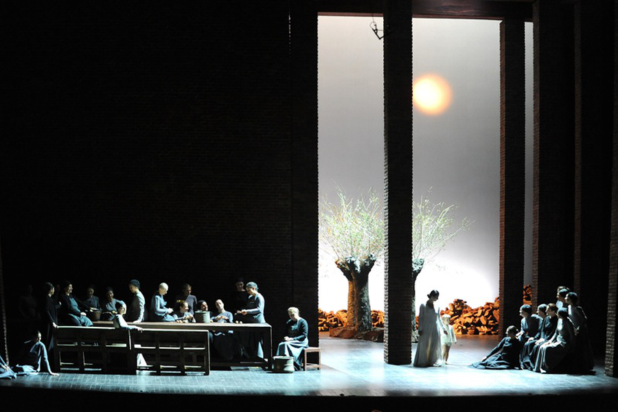 Спектакль известного дизайнера-режиссера Пьер Луиджи Пицци из серии «вечно тех же, вечно новых». Пицци, синоним элегантности, любви к простым и изысканным цветовым сочетаниям и строгости линий (архитектор по профессии, он всегда остается архитектором и дизайнером), верен себе и тогда, когда ставит патриотическую оперу Верди эпохи Рисорджименто. Избранные архитектурные элементы – кирпичные колонны, кирпичные стены. Немногочисленные аксессуары – пара деревьев, крест – все строго дозировано, красиво, функционально и безупречно. Настоящий праздник для глаз, праздник и в том, что касается световых эффектов (Винченцо Рапони использует один цвет в различных градациях) и костюмов. Благородная серо-серебристая гамма преобладает, для платьев героини выбраны белый, фиолетовый и черный цвета: словом, еще раз никогда не надоедающие вкус и элегантность. О собственно режиссуре говорить трудно: как всегда у Пицци, спектакль принадлежит к жанру tableaux vivant.*