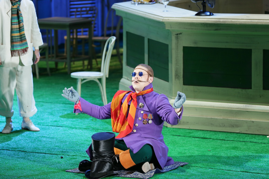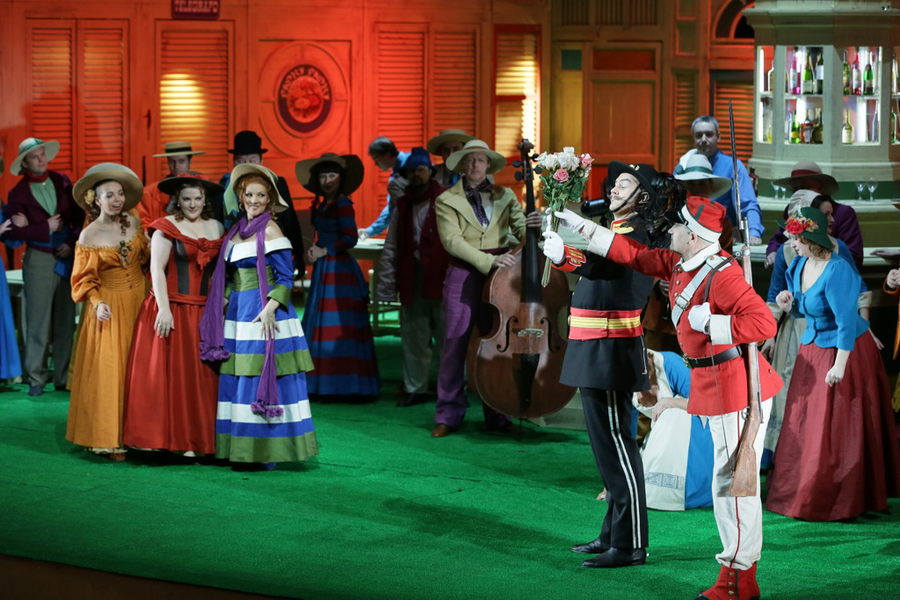 Однако Петров и Фирер — на территории комической оперы, и, разумеется, были далеки от мысли создавать лунные фантазии. Они мыслят «чисто конкретно», их спектакль залит ровным солнечным светом, в котором совсем нет теней, зато есть кричаще яркие краски костюмов, и целлулоидный зеленый лужок. От сочетания болотно-зеленых, синих и белых полос на юбке Адины сводило скулы: немыслимая гамма цветов была приправлена еще и фиолетовым шарфиком на шее. Бравые солдаты сверкали алыми ботами; широкополые шляпки и рискованные декольте деревенских прелестниц воспламеняли воображение. Посреди лужка высилась круглая барная стойка с массивной кассовой машиной и поставцом в центре. Сооружение явно смахивало на фонтан, что обыкновенно стоят на площадях итальянских городков; что заставляло всерьез задуматься о количестве потребляемых пейзанами горячительных напитков.