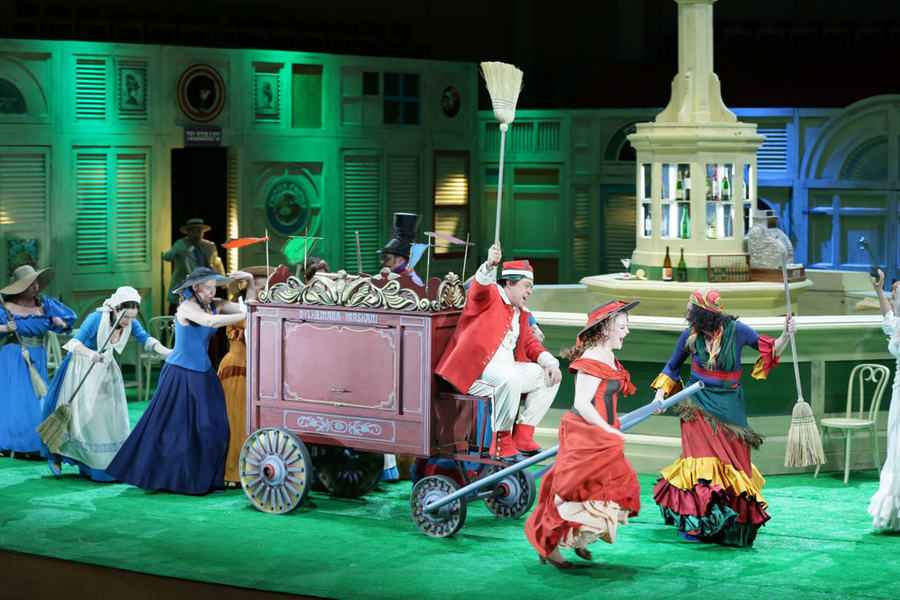 Мягко «бумкал» в заглубленной донельзя яме оркестр, изображая «большую гитару». За пультом стоял опытнейший Павел Бубельников, знаток итальянского белькантового репертуара: вместе с Петровым они поставили немало россиниевских опер. Однако почему-то именно на премьере «Напитка» оркестр звучал неградуированно, однообразно, порой слишком прямолинейно в смысле артикуляции — а тут хотелось изящества, легкой игры, кокетливых реверансов в сторону Доницетти.