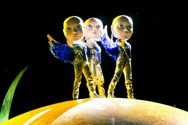 Но если фантазия Йохана Энгельса велика, то фантазия Мари-Жанн Лекка просто невообразимо велика. Она не только одевает героев в оригинальные костюмы, но заменяет отдельных персонажей (трех дам Царицы Ночи и трех мальчиков Зарастро) действующими огромные и поражающими воображение куклами. Три дамы гордо восседают на птеродактилях, которых ловко носят по наклонной поверхности три мима, тот, что в середине, «отвечает» за дикцию, дергая за веревочку, привязанную к подбородку. Полная иллюзия, что кукла поет! Три большеголовых мальчика и с огромными глазами и без волос напоминают кукол, которыми в детстве играют девочки. А как же пение, спросит читатель? Певцы, исполняющие партии трех дам и трех мальчиков, «спрятаны» в Фестшпильхаусе и увидеть их можно только после окончания представления, когда они выходят на поклоны.