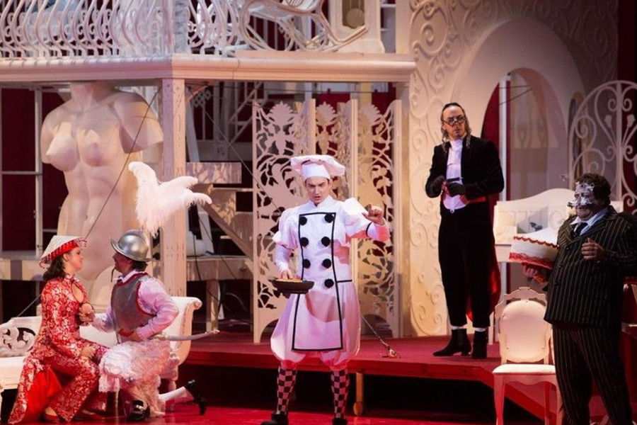 В самом деле, эти бесконечные перевоплощения героев и карнавальные переодевания на сцене (художник по костюмам Елена Бочкова) утомляют и распыляют внимание, озадачивают и вызывают недоумение. У Россини Фигаро – лукавый цирюльник-плут, но весьма добродушный и не слишком корыстный, Розина – кокетка, но вполне невинная и безыскусная, Альмавива – уверенный в себе и вальяжный ухажер, однако не лишенный аристократического благородства. В александровском же спектакле Альмавива – то ковбой, то какой-то странствующий рыцарь-всадник; Фигаро, выйдя в каватине в женском платье, в дальнейшем предстает в образах повара, трубочиста, авиатора эпохи ретро, а в некоторых эпизодах одет в костюм в шотландскую клетку с бриджами и головным убором а ля Доктор Ватсон. Розине тоже досталось – в диапазоне от некоей горячей испанской Карменситы, правда клоунского вида, до вьетнамской девушки. И Бартоло в своих метаморфозах от них не отставал. Им противостоял лишь беспринципный Дон Базилио в неизменном одеянии хасида (!), довольно двусмысленно намекая – в этом изменчивом мире постоянна лишь алчность.