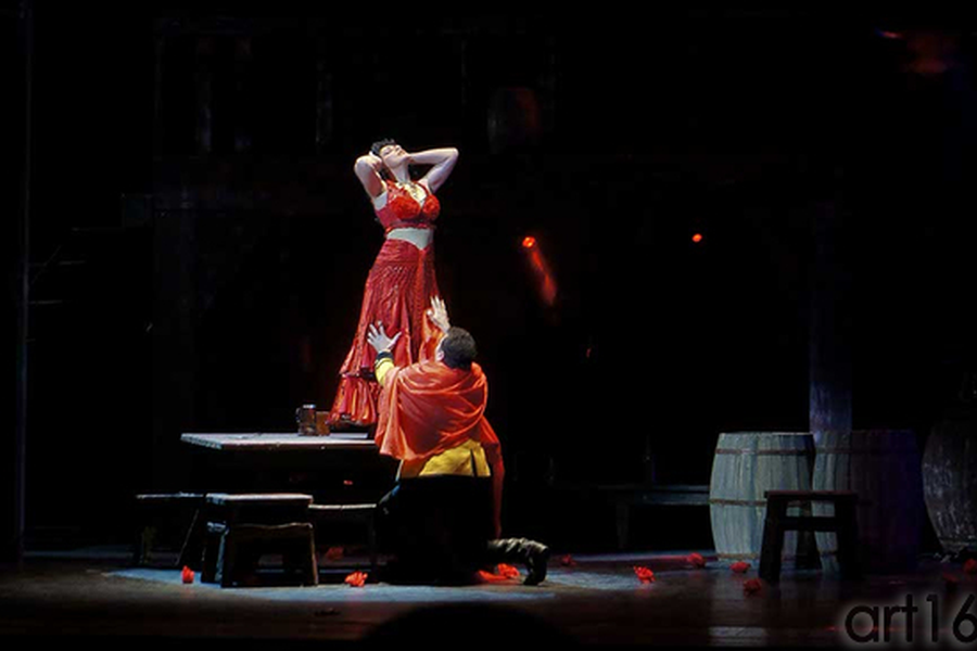 «Кармен»! Непросто отличиться в столь заигранном оперном шлягере. То, что балетмейстер Георгий Ковтун не удержался, чтобы использовать по максимуму свой профессиональный опыт в постановке этой оперы Бизе – объяснимо. Слишком уж велик соблазн, да и зажигательные ритмы музыки этому способствуют. Но где же чувство меры? Получился явный перебор. Тут, возможно, сказалось и еще одно обстоятельство, которое изначально учесть было невозможно. Дело в том, что в нынешнем своем виде постановка лишилась своего кинематографического антуража, который присутствовал на премьере трехгодичной давности. Тогда все действие было обставлено как некая съемка фильма, и это, вероятно, могло хоть как-то уравновесить и оттенить танцевальную стихию зрелища. Нынче же этот контраст исчез и, подчас создавалось впечатление, что ты находишься не в опере, а на концерте какого-то ансамбля песни и пляски. Начальная сцена сразу вызвала в памяти слова из классического русского перевода либретто: «Оживленною толпою все снует и бежит». Собственно, эта фраза исчерпывающе передает характер сценического действия. Разве что режиссер добавил немного мистики – начиная со Сцены гадания героиню преследуют какие-то загадочные «духи», предвестники смерти. Однако, попытки привнести в эту «вампуку» нечто душераздирающе непривычное – Кармен гибнет не от ножа, а очень театрально задушена шарфом – мало помогают. От обстановки все равно веет каким-то духом презентабельного зрелища, а не жестокой драмой. Роковым образом сказалось и странное решение укоротить увертюру. Без своей второй части с ее важнейшей драматической темой, мелодически предвосхищающей трагическую развязку и плавно вливающейся в основное действие, она тоже превратилась в чисто концертный номер…