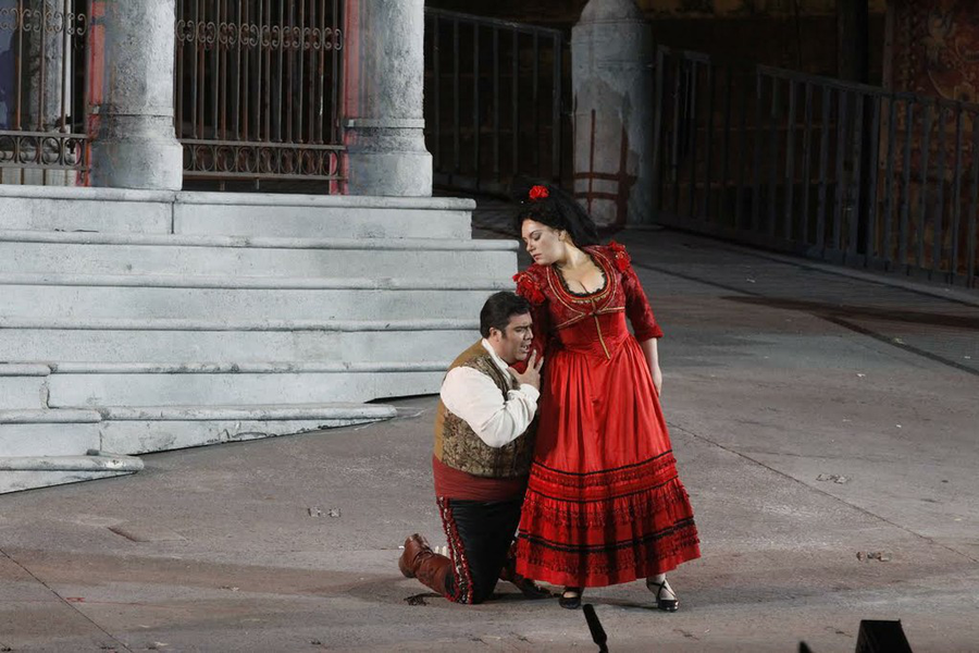 Когда речь идет об Арена ди Верона, самом прославленном театре под открытым небом, без крылатой пушкинской фразы «он вечно тот же, вечно новый» не обойтись. С поправкой на женский род, ведь Арена – она, Синьора Арена. Если придать этой фразе вопросительный оттенок, то ответ будет коротким - «вечно та же». Как всегда, когда речь идет о долго существующих и бесконечно повторяющихся вещах, в них есть много приятного, мирного и успокоительного. Список прокатываемых в Арене названий невелик (в основном это оперы Верди и Пуччини, к коим иногда добавляется «Кармен», а в последние годы «Ромео и Джульетта» Гуно, два года назад публику «одарили» роскошнейшим и скучнейшим «Дон Жуаном» в постановке Дзеффирелли), и от оперного преставления всегда знаешь, чего ждать. В принципе, попытки обновить привычное зрелище в Арена ди Верона крайне редки и заканчиваются они, как правило, несчастливо, достаточно вспомнить ужасающую «Аиду» 2007 года в постановке телевизионного режиссера Джампьетро Солари или продукт образца года 2013, бездушно-механическую «Аиду» каталонской театральной группы La Fura dels Baus.