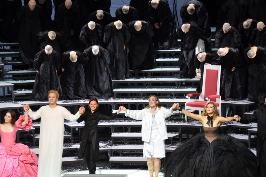 Первое исполнение «Титуса»* с генералмузикдиректором Баварской Штаатсопер Кириллом Петренко захватило впечатлением целостности интонационного мира Моцарта. При этом совершенство звучания оркестра, динамика музыкальных образов «позднего Моцарта» полемизировали со статической сценографией спектакля — со стилистикой имперской ультрацеремониальности декораций, с презентацией аффектов, увеличенных «под лупой» видеоинсталляций, с пародийно-роскошными псевдобарочными костюмами и париками (режиссер Ян Боссе, сценография Стефан Лейме, костюмы Виктория Бер, видео – Биби Абель).